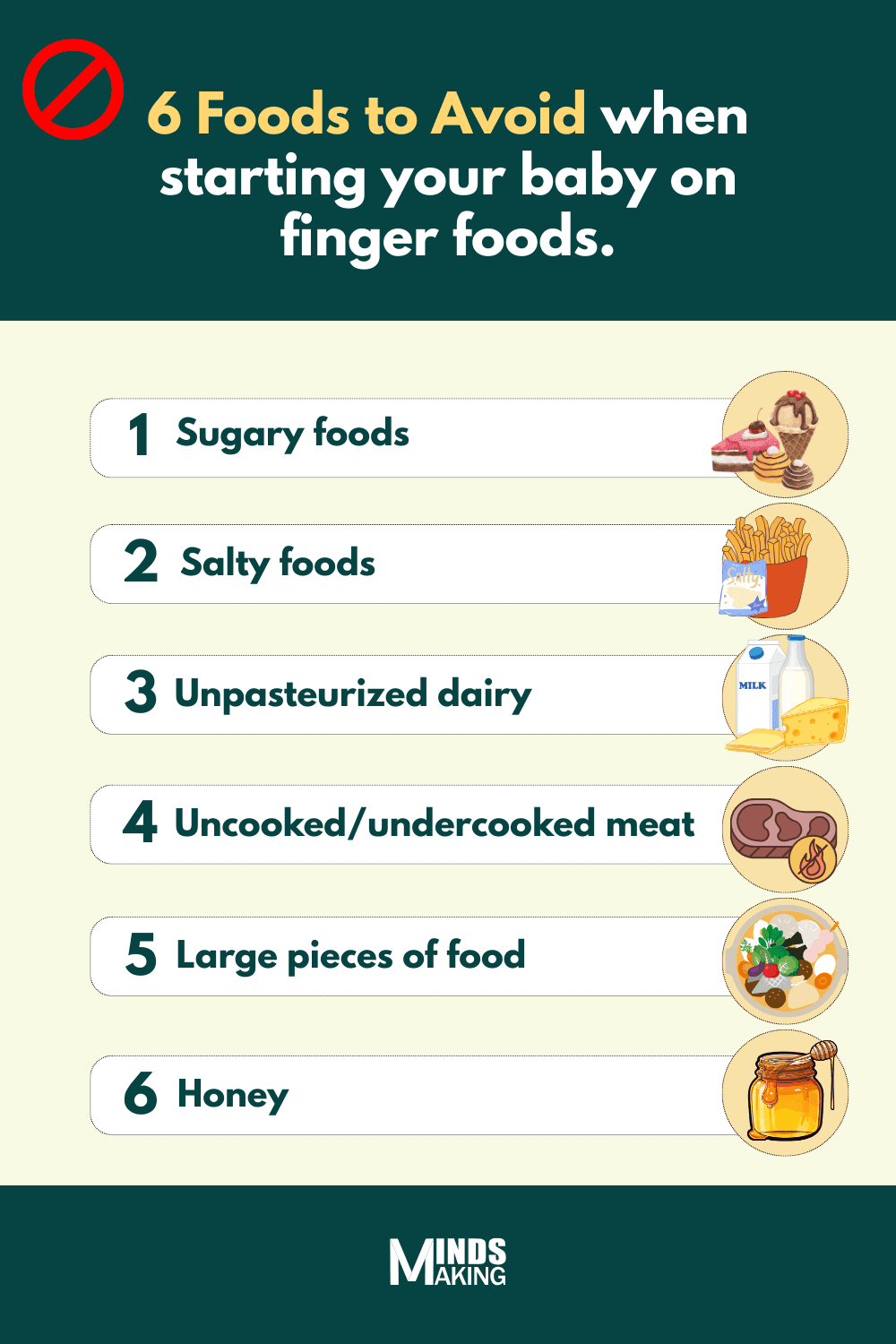 When introducing finger foods to your baby, the goal of this transition is to provide a variety of finger foods that are safe, nutritious, and help develop their motor skills. However, some foods can be harmful to babies, either because they can lead to choking, tooth decay, or other health concerns like food poisoning and kidney problems. Foods to avoid include(6):