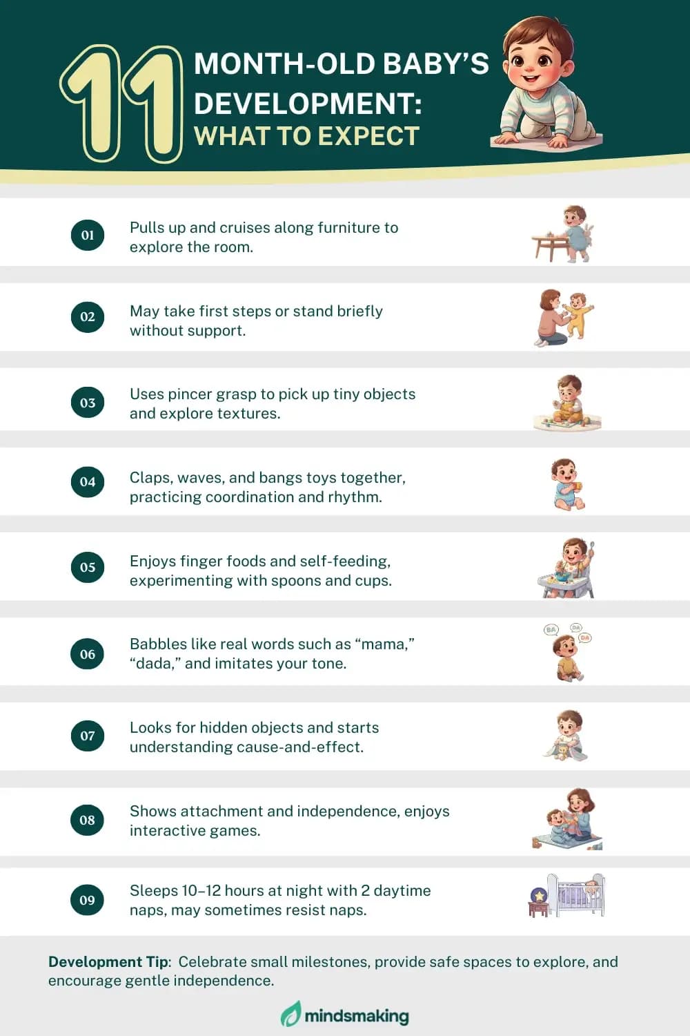 Many 11-month-olds are learning to move sideways while holding onto furniture for balance and stability. It is their way of rehearsing for walking. You might even catch them pausing and laughing for applause after a few steps, as if to say, “Did you see that?”