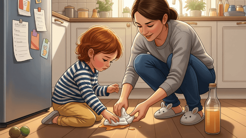 Tip: Keep it lighthearted! Gently point out that it’s okay to make mistakes, and that cleaning up is part of learning. Redirect the situation positively and offer praise when they take responsibility for their actions.