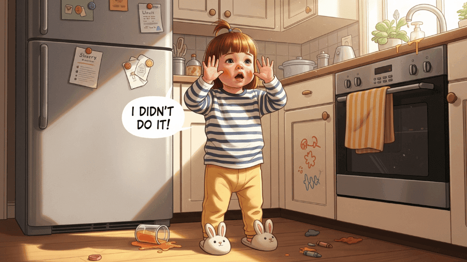 The classic toddler move—before you even ask about the spilled juice or crayon marks on the wall, they’re already denying involvement. It’s like they have a built-in defense mechanism, and they’re ready to use it at all times.