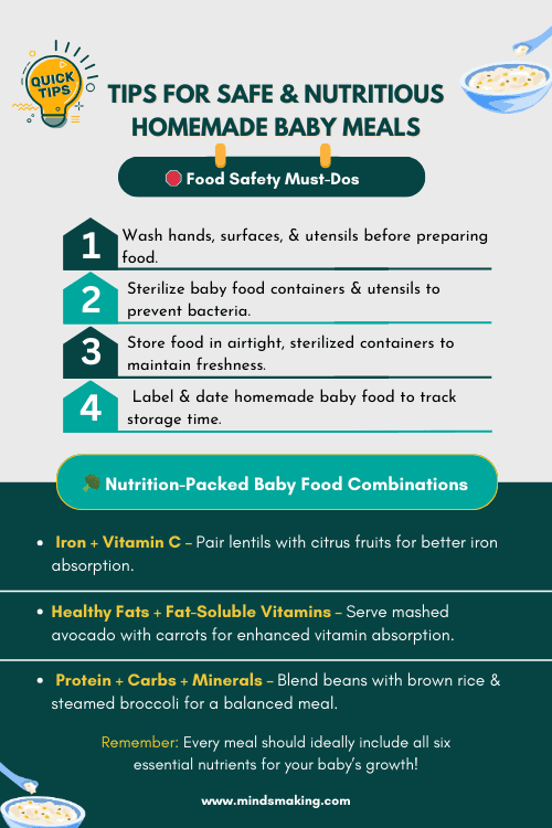 These concerns highlight the need for parents like you to study homemade baby food quality assessment, such as best practices and guidelines based on expert recommendations, to ensure the safety and quality of your baby’s meals.