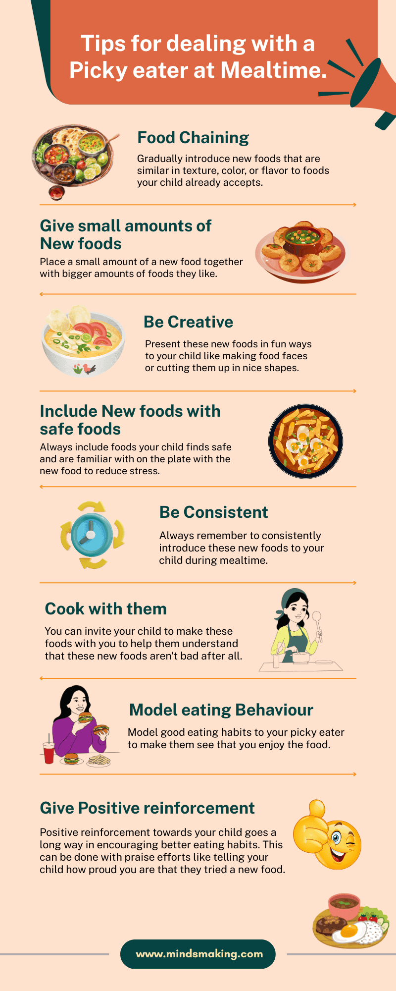 Researchers found that pressuring children to eat, offering bribes, or showing frustration actually worsens food aversion and reinforces selective eating habits(17). Instead, experts recommend that you exercise patience and model healthy eating behaviors to your children as key techniques for change.