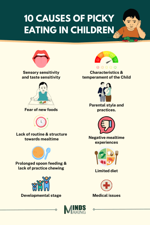 Picky eating in children can be caused by various things such as sensory sensitivity, fear of new foods, a child's temperament, health issues, negative experiences, limited diet and parenting style.