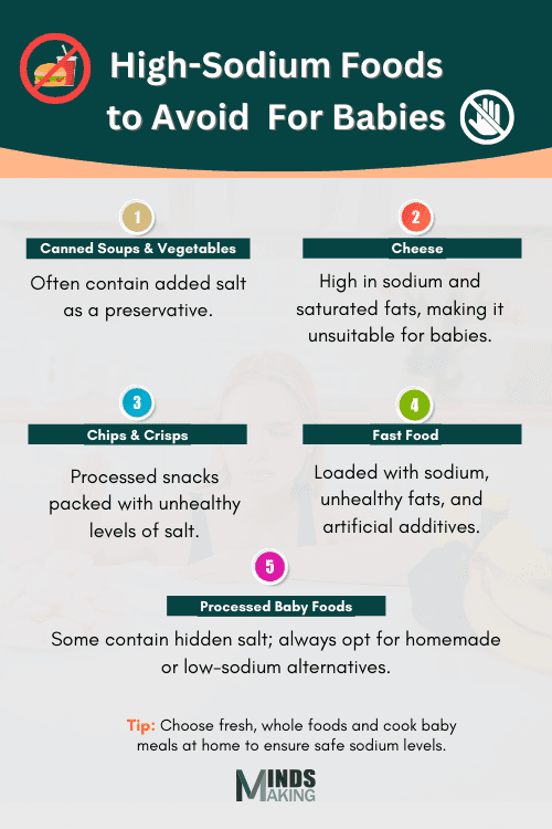 Processed Baby Foods: Not all store-bought baby foods are created equal, some contain hidden sodium to improve taste and preservation. Always check the labels before buying and look for low-sodium options.