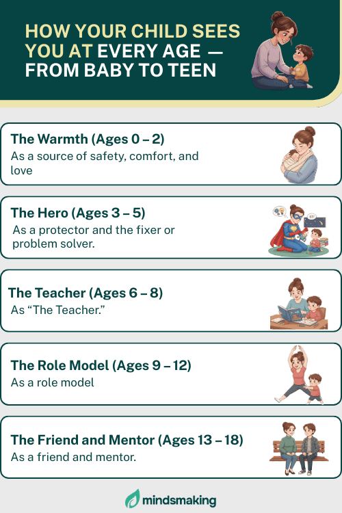 Their view of you will evolve with age from complete dependence in infancy to a hero in early childhood to critical thinking in adolescence. In this article, we’ll offer insights into how your child most likely sees you at every age, from a baby to a teen, and how these perceptions shape child development, parent-child relationship, and how you can respond thoughtfully through every season of parenting.