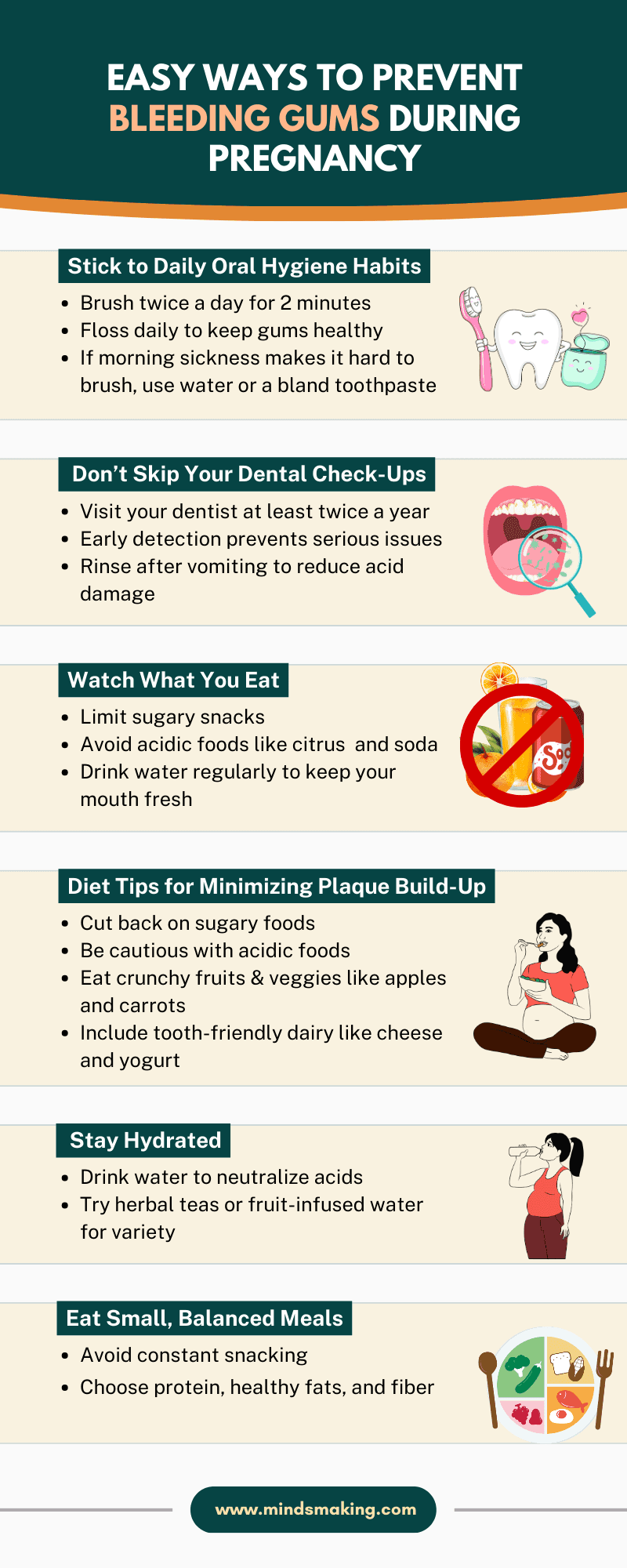 To prevent pregnancy gingivitis, focus on good oral hygiene, regular dental visits, and a healthy diet. Brush twice daily with fluoride toothpaste, floss daily, and drink alcohol-free mouthwash.