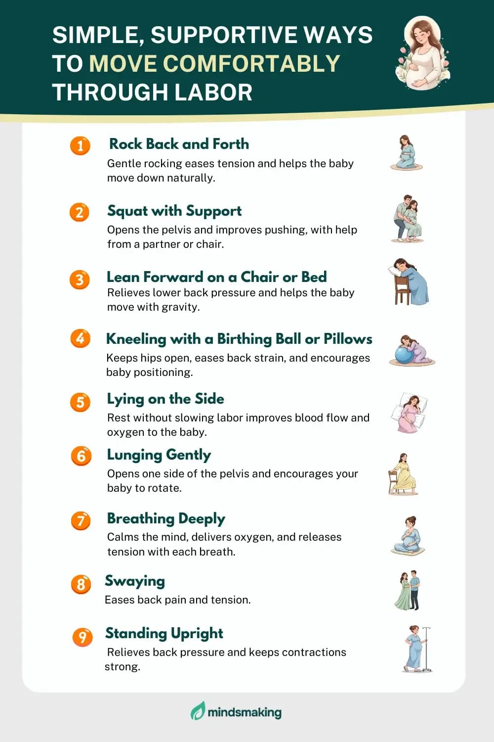 Some positions, such as rocking, squatting, leaning forward, kneeling, side-lying, lunging, swaying, standing, and deep breathing, support progress and comfort.