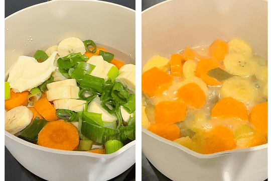 2. Cook everything together: In a medium saucepan, toss in the chopped carrots, plantain, and spring onions. Add 1¼ cups of water — just enough to slightly cover the veggies. Stir in the tablespoon of unsalted butter for a touch of richness.